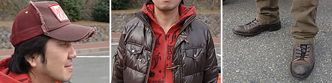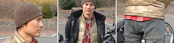 バイクから離れても違和感が無いのが僕の持論。今回はチョコレート色の長めのダウンジャケットに茶系のカーゴパンツ、インナーにはZipパーカでコーデ。上下が茶系でシンプルなため、差し色に赤いパーカをセレクトしました。パーカは全体にペイズリーのプリントが施されていて一見派手ですが、インナーに合わせると煩くないでしょ?
