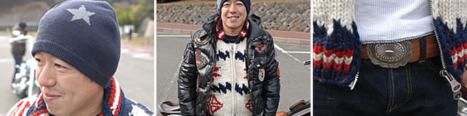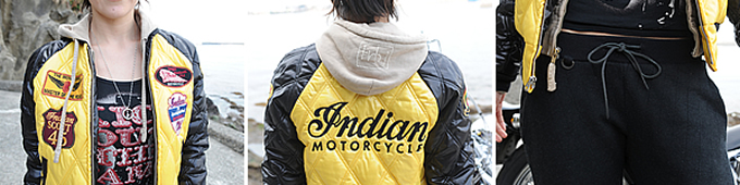 アウターはハーレー乗りの定番 “インディアン”。軽量で着心地満点の中綿キルティング・ブルゾンです。ダウンほどモコモコして見えない特徴を活かして、スタイリッシュに着こなしていますね。愛車のカラーリングに合わせたコーデに、差し色のイエローが絶妙ですね。デカサンも非常にお似合いですよ。