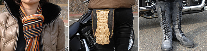 レザーブルゾン、ブーツ、メディスンバッグとハードなアイテムを取り入れながら、ハズシの暖色ストールで逆に綺麗めに見えますね。足元のロングブーツは、レースアップの細身感をブーツインで強調しているのが”今どき”っぽくていいです。こんなスタイルでバイクに乗るのには、好感持てます。