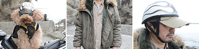 トイ・プードルの”千代子さん”がFXSTSのオーナー!? という設定のお二人? 千代子さん、ヘルメットにウェア、サングラスとオシャレにも気を遣ってますね。特にバイクとヘルメットのカラーがお揃いなのはいいですね。ただ、ノースリーブのウェアは…寒くないのかな(笑)。