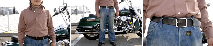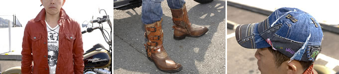 多くのハーレー乗りが“これ制服なんです!”と言わんばかりに着用しているダブルのライダース。そこで注目したいのが無数のスタッズが施されたライダースです。その他大勢との“差”が演出されていますね。タイトに着こなしたサイズ感も◎。しかし全体がシンプルに見えて寂しいと思われるのは、ベルトが見えないから……。その理由は、ジーンズの股上が深いからなんです。ショート丈のジャケットですからローライズのボトムスでベルトをチラ見せすればアクセントになり印象も変わりますよ。