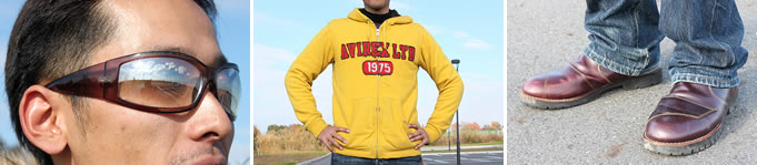 【左】サングラスが似合っていますね~。これは掛け方にポイントがあります。私がアイウェアにこだわること、それは掛けたときのサングラスと眉毛の位置関係です。私は顔がデカイため、レンズの大きさにも気を遣いますが、特に眉毛がほぼ隠れるように調整しています。眉毛とレンズフレームの位置の間隔が開いていると間が抜けて見えるからです(Riders Style.4 参照)。どこを調整するかというと、“鼻当ての位置”を調整します。日本人は鼻が低いため、ズリ落ちてきまうんです(涙)。アイウェア専門店で調整できますので、ご自身に合った掛け方を相談してください。洋服を着替えるようにサングラスも使い分けると、ファッションの楽しさもグッと広がりますよ。 【中央】バイクのカスタムと一緒で個性出したいのなら、“AVI〇〇X”は無いんじゃないの? たくさんのハーレー乗りが着てるよね。チラリと覗くインナーの黒が重たいかな。 【右】ボトムスのレングスはいい感じです。バイク用のブーツはチェンジペダルでの痛みを防いでくれますが、いかにもバイク専用の印象が強く、オシャレ感が薄いです。一般のブーツでも、チェンジペダルで傷ついた箇所をクリーム等で手入れすればそんなに目立たないと思いますよ。
