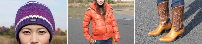 【左】ワッチ(ニット帽)はパープル系のカラーが、オレンジのアウターとのカラーコーデは相性良いのですが、どうも派手なカラーがウインタースポーツウェアを連想してしまいます。トーンを抑えたカラーなら違和感ないでしょう。 【中央】インナーの黒いハイネックも防寒の為に着ていると思いますが、ファッション的には……。オシャレ感を演出するなら、女性らしい衿ぐりの深いインナー+防寒対策にストールがオススメ! 茶系のインナーもオレンジのアウターと同系色でかぶってしまい地味な印象に。 【右】ウエスタンブーツはエンジニアブーツに比べ足元が重たく見えずスッキリとし、タウンユースでも重宝しますね。