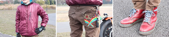 【左】ワインカラーのスポーティーなZIPパーカ。カスタムした愛車との相性もイイね! 実際、当ショップでもこんなカラーをセレクトする人ってファッション好きな人が多いですよね。ファッションに自信の無い人って“こんなカラー、何と合わせれば良いか分からない”って人が多く、そんな人たちは黒・紺・茶等……結局こんな無難な色をセレクトするんですよ。もったいないよね。【中央】細身なパンツは、ヒップポケットがインパクト大!なレインボーのアクセント。こういう遊び心って大事だよね。この“レインボー柄”があるのとないのではまったく印象違うからね。【右】チェリーレッドの8ホールのブーツ。アウターのカラーと合わせて一体感があります。しかし残念なのがパンツの裾幅が細いので収まりが悪いのがマイナスポイント。もう少し裾幅が広いボトムスでアウトにするか? ブーツインでスッキリ見せるか? インしてバイクに跨ると8ホールでは裾が出てくる可能性があります。タウンユースなら問題ないと思うけど、バイクに乗ってブーツインするなら10ホールがオススメですね。