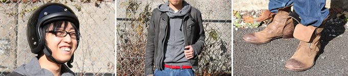 ライダースジャケットにパーカーをレイヤード。うん! こんな着こなし、私は好きです! ライダースジャケットだけではハードな印象もフードを出して立体感が生まれれば、ハード過ぎずカジュアル感を演出することができます。ボトムスはインディゴカラーの太めのジーンズで裾の“半出し”テクを投入!(某ファッション雑誌で推薦) バイク雑誌だけでなく、ファッション紙にも目を通しているのでしょうか? 最近の若者のバイク離れの中、22歳という若さで貴重なバイク乗りのイシデさん。将来のバイク業界を引っ張ってくれるのを期待したいですね。頑張ってくださいね!
