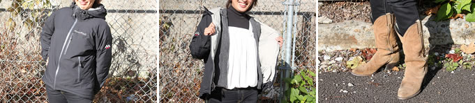 【左】アウトドアブランドで有名なモンベルの多彩な機能を備えた高機能パーカ。防風性、高い保温性、さらに強度に優れた生地など、この季節にはバイク乗りにピッタリなアウターで文句ナシ。ファッション面を除けば……(涙)。「寒いから」とか、「風が……」といった理由は分かるんですが、“ファッション講座”としてのコメントは……“ダ・サ・イ!”の一言だけっ。百歩譲って防寒性のために着用していると思うんですが、女性なんだから黒色はないですよ~。女性らしい華やかなカラーをセレクトしたらもっと可愛くなるのに。競馬・競艇場などで楽しんでいるオジサマたちも同じの着ていそうな色じゃない?(笑)【中央】キャミソールは夏に素肌に着ると可愛いんだけど、何でハイネックに合わせているの? 季節感も若干ズレていますよ~。今年の夏も「肩を出したくない」、または「二の腕を隠したい」という理由で“若いと呼べる年齢じゃない女性”がキャミ下にTシャツを合わせるレイヤードの着こなしが印象的だったけど、何でハイネックに? 女性らしさを演出したかったのかなぁ? 【右】サンドベージュのウエスタンブーツは黒色のボトムスとのカラーバランスがイケてません。全身を見てくださいっ。ブーツのカラーだけ浮いてるでしょ? ここは無難にインディゴカラーのジーンズやカーキのボトムスならサンドベージュのブーツとも相性良いよね。
