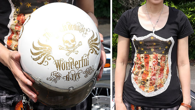 この方の場合ですと、アクセサリーを黒で統一された方が潔いでしょう。茶色のレザーはハーレーとの相性が抜群なのですが、彼女のコーディネイトでしたらここは黒で統一されて、モノトーンネイティブを意識されてはどうでしょうか? バイクがクラシックですので、モノトーン以外のコーディネートにも充分対応できると思いますので、そのときにこの茶色のレザーケースを合わせてみても良いかと思います。
