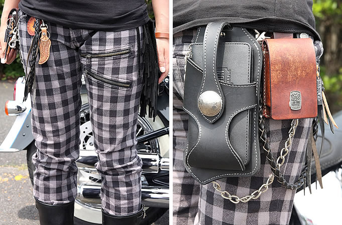 ただ、あえて言わせていただくなら、腰回りのアクセサリーが少しうるさいかな……と感じます。愛車のスタイルも純正のままがお気に入りの様子ですし、アクセサリーもハーレー純正で揃えられているのはまったく問題ないのですが、ちょっと多いかな、と。夏場ですので、アウターも薄手のものになるでしょうから、ポケットにモノを入れると膨れ上がるのでシルエットも台無しになる恐れがあります。ですから腰元に財布ケースや携帯ケースを身に付けられるのは必然だとは思います。