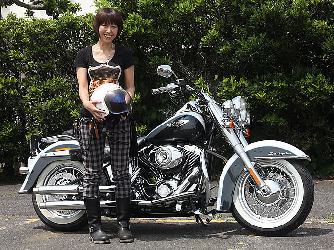 最近は女性のハーレー乗りが増えているようですが、初バイクがハーレー! しかも.ソフテイルとは……恐れ入ります。ファッションも、男性らしさと女性らしさをバランス良く組み合わせておられます。サイズ感も、ご自身の体型をちゃんと把握していらっしゃるのでしょう、スッキリと見えますね!