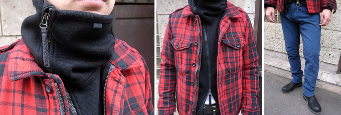 まずは TOPS からご紹介します。“RELWEN (USA)”のバッファローチェックの CPO ジャケットとインナーに、”MAHARISHI (LONDON)”のハイネック ZIP ニットを合わせてみました。この赤黒のチェックは、アメカジ好きの方には定番の柄だとは思うのですが、かなり土臭いイメージも付いてきます。ですので、インナーにデザインが施されたニットを挟むことによって、新旧のバランスを取ることを意識しました。ニットの ZIP も下から上に向かって垂直ではなく、ダブルのライダースのような若干斜めに向かっていますので、バイカーのイメージを少しだけ匂わすデザインに仕上がっております。CPO は裏側にキルティング、ニットは高圧縮で編んでいますので保温性も申し分ありません。