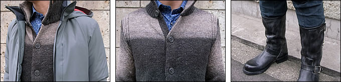 続いてインナーに選んだのは NSF (アメリカ)のニットカーディガンなのですが、ここで大野さんのヘルメットに注目していただきたいのです。車体のブラウンに合わせたグラデーションがなんともオールド感を醸し出していると思いませんか? そこで、このニットの登場となりました! こちらもブラウンをベースにグラデーションしており、統一感を狙いました。そして、よりファション性を高めるために、U-NI-TY (イタリア)のドット柄のシャツをニットのインナーとしてチョイスしました。防寒性という点でバイカーとしてはなんとも心もとないかもしれませんが、AETHER のダウンがかなりの高機能ですので、実現されたコーディネイトになります。