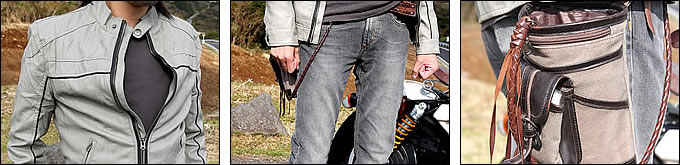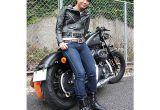 まず無色のライダースですが、色味のあるモノにチェンジ! 真っ黒いライダースはみんなと同じになっちゃうし、個性がなくなっちゃうんで NG ね。そしてボトムス、これもグイッと引き上げ気味で履かれていますが、チョイ落としの腰履きがグッド! ウエストまでグイグイ上げてしまうと、お尻のラインがプリッと出て可愛くなっちゃいます(笑)。濃淡あるユーズド加工を施したしたジーンズだと作業着っぽく、戦闘機をイメージしたこの愛車に合うと思います。足元はお決まりのエンジニアブーツで。ウエストバッグは愛車の存在感から比べてしまうとチープな印象。革小物は値段と比例した見栄えになりますから、アラサー以上、いやアラフォー以上は半ば強制的にそこそこのものを(笑)。ここケチると、全身のイメージがマイナスに見えますから。