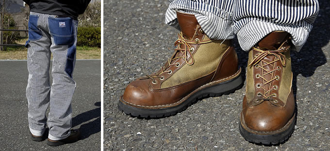 2回連続して旧車乗りの登場ですね。実は私も旧車に興味が湧いているんですよ(笑)。さて、今回のオーナーさんのファッションは、防寒性の良さそうなアウターに、ヒッコリーのぺインターパンツでコーディネート。そして、またしてもインナーが見れずっ!(涙) 走行中の画像じゃないんですよ。ファッション講座なんだから、アウターのファスナー開いてインナーも撮影して欲しいです……。愚痴ってスミマセン。今回のファッションは、ご本人曰く“バイクに乗っているとき、降りたとき”を意識されてのコーデのようですので、革チョッキやチャップスなど、バイカー御用達のアイテムじゃないから、バイクから離れても違和感がないとは思います。