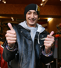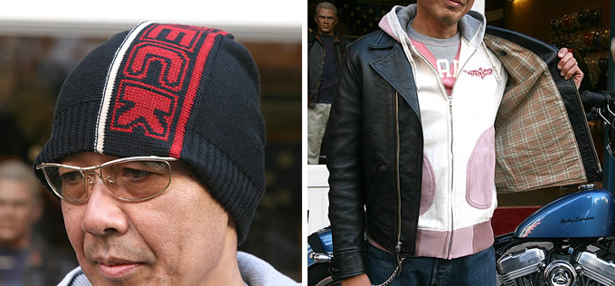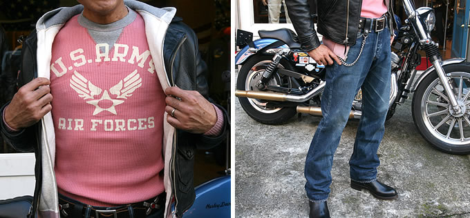 今回コーディネートさせていただく中でテーマとして掲げたのが“バイクを降りても違和感なく街を歩ける”という点です。当店はFJ・ライダースジャケットをはじめ、いろいろなアメカジ系ウェアを揃えておりますので、いわゆる定番スタイルでまとめながらアクセントを入れ、さらにおこそんさんのスリムなシルエットを生かすコーディネートをさせていただきました。明るいライトチェリーのサーマルがポイントのひとつですが、このカラーは当店でも人気があります。差し色という点でもファッショナブルに見せられますし、オススメの一品です。“バイクとセットにしたトータルコーディネート”という点から見ても、オーナーの存在感を引き立たせる方向にまとめています。バイカーズギアにとどまらないファッションの楽しさが垣間見えれば幸いです。