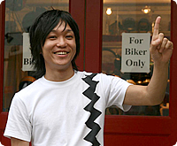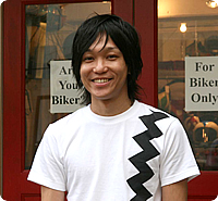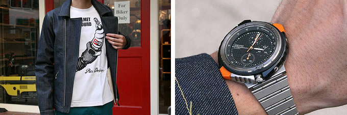 関さんのファッションは、着用しているポロシャツなどから分かりますが、どちらかと言えばヴェスパやランブレッタのようなヨーロッパのお洒落バイクに乗っていそうな上品な感じになっていますね。しかしバイクを見てみると、モノトーンでまとめたレーシーな雰囲気が漂うアイアンですから、“レーシー”な雰囲気を出してみてもいいんじゃないでしょうか。パンツのシルエットも、ゆったりしたものよりビシっと引き締まったジーンズなどが似合いそうですよね。この辺のポイントに注意しながら、良い意味でラフにしていこうと思います。そう、いわゆるライダーズテイストを取り入れるわけですが、レザーで固めたコッテコテのものではなく、あえてレザーを使わずラフにしちゃいましょう。