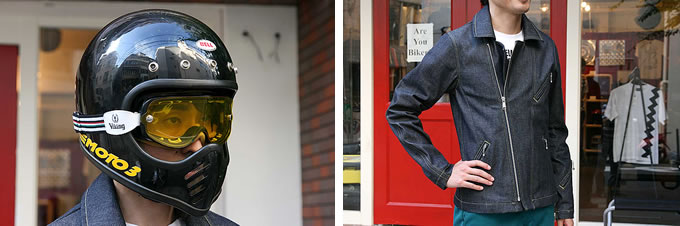 あと今回は当店の自慢であるヴィンテージヘルメットもセットにしてみました。ライダーとしてはヘルメットもセットにしてお洒落にまとめたいですよね。それぞれの愛車との相性というのもあると思いますが、ヴィンテージヘルメットは服と合わせてレトロフィットさせられるので、トータルコーディネートという楽しみ方も検討してみてください。ウチには BELL や BUCO のほか、多種多様なヘルメットを揃えていますから、ぜひ一度見に来てください。