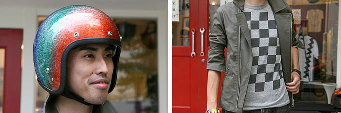 こんな感じでまとめてみました。本当は細身のジーンズなども取り扱っているんですが、まだ入荷前だったもので……残念! 腰下を引き締めていたら、もっと印象が鋭くなったかも? と自己評価しておきましょう(笑)。レザーを用いたらバイカーっぽさが出てまとめやすいんですが、どうしてもイカつくなりがちですよね。せっかくカッコいいバイクに乗っているので、そのまま街に繰り出しても違和感がないようにしています。ウチもあまりコテコテのバイカーファッションにならないようなアイテムを取り揃えていますので、バランスよく着こなせれば“ライダーっぽいけどお洒落”といったナイス!な感じになれますよ。