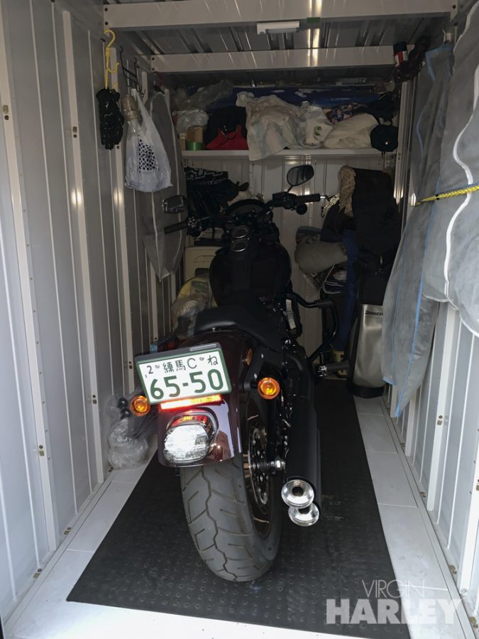 普段使っているバイクガレージにローライダーSを収めたところ。普段はイタリア製スポーツバイクを収めているが、サイズ的には問題なく格納することができた。