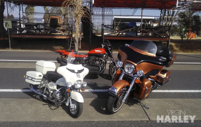 M.T.さんが、現在所有しているFLHTCU105thアニバーサリーと、XR1200X、キジマ製パーツなどによりFLHTCU仕様にカスタマイズされたモンキーの3台。