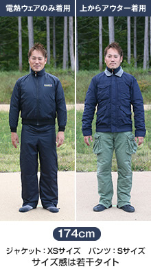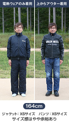 この電熱ウェアを製造しているガービングはアメリカの企業。そのために、サイズの設定は国産のライディングギアより大きめだ。身長164センチのモデルは、国産ウェアではMサイズを使用しているが、上下ともXSサイズでやや余裕がある感じだ。174センチのモデルは、国産品ではLサイズのウェアを選ぶことが多いとのことだが、ジャケットはXSサイズ、パンツはSサイズがもっとも身体に合っていた。182センチのモデルは国産品の場合XLサイズかXXLサイズでないと小さくて着られないのだが、上下Lサイズだと十分に余裕があり、Mサイズがジャストフィットだった。標準体型であれば、いつも着ているウェアから最低でも1サイズは小さいものを選ぶのが良いようだ。また、それぞれ電熱ウェアの上にライディングギアを着てみたが、着膨れしたような印象は薄く、身体を動かすのも問題ない。