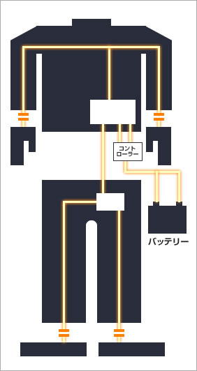 ガービング 電熱ウェアの特徴のひとつに、ラインナップが豊富なところが挙げられる。ジャケットとパンツをはじめ、ベスト、グローブ、インソールなど使用条件に合わせたさまざまなアイテムが用意されており、また温度コントローラーなどのオプションパーツも実に充実している。好みや、使用する環境に合わせ、使用者が自由にシステムを構築することが可能となっている。この自由度の高さも電熱ウェアのメリットだ。