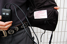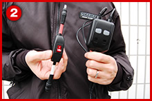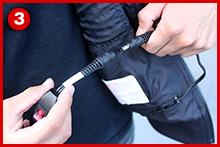 温度コントローラーないし ON/OFF スイッチを介し、ウェア側の電源ソケットと接続させる。ソケットを抜いてしまえば電流も遮断されるので、バイクから離れているあいだ、無駄に電力を消費することもない。