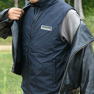 秋口など、気温が下がりきっていない時期であれば、フル装備では熱過ぎる場合もある。そんな季節には、レザージャケットの下にガービング製のベストを組み合わせるのがオススメだ。