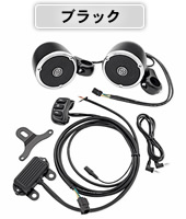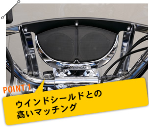 | 2個の89mm大音量スピーカーが内蔵されたスマートなスピーカーキット。ブラック&クロームの流線型デザインがシールドに違和感なくマッチング。これぞ、純正クオリティーと言える出来! |