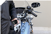 | 標準的な3.5mmのステレオ入力端子を採用しているので、ほとんどのポータブルオーディオに接続可能。 もちろん、ポータブルオーディオをポケットなどに入れて使うこともできる。ただし降車時は注意が必要。 ハンドコントロールの取付けは、ご覧のようにオフセットされるので、グリップを握ったままでも操作可能。 |