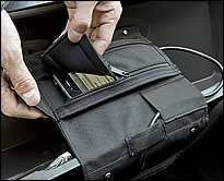 | ポータブルオーディオを使いイヤホンで聞くという手もあるが、空間が音楽で満たされる迫力とは別モノ。 マグネットで装着できる別売りのブームオーディオ・タンクポーチ(●91003-10 7750円)がオススメ。 ボリューム調整ボタン、オーディオのオンオフボタンが付いたハンドコントロールをスイッチサイドに装着。 |