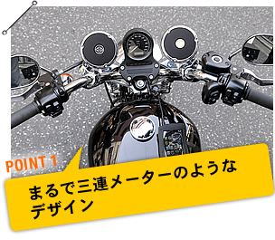 | センターに配置されたスピードメーターとの対比で、三連メーターを思わせるスタイリッシュなコックピットを演出。バー&シールド・メダリオンが誇らしげ。89mm大音量スピーカーが迫力満点! |