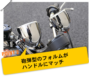 | 防水&高い耐震性を誇る砲弾型のスピーカーポッド。なんともソソるデザインだ。車両に合わせて、写真のクロームタイプの他にブラックもラインナップ。もちろん流行のファットバーにも装着可能。 |