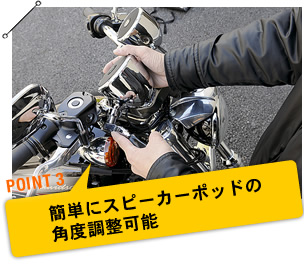 | ラチェットで簡単にスピーカーポッドの角度を調整できる。ライダーに向けてダイレクトにサウンドが届けられるというわけ。二人乗りならパッセンジャーのことを考えて角度を調整することも可能。 |