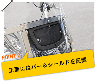 | ヘッドライト側、ウインドシールド正面からのルックスも抜かりなし。ブラックベースにバー&シールドロゴがエンボス加工され、シールドのアクセントとなっている。高い耐震性&防水性を誇る。 |