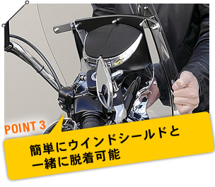 | スピーカーを接続しているワイヤープラグを外せば、デタッチャブル式ウインドシールドと一緒に、わずか数秒で取外しができる。つまり簡単に外して保管ができるので、盗難対策としても有効。 |
