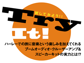 ツーリングファミリーのロードキングシリーズを除いたモデルに標準装備される純正オーディオシステム。これは「音楽とともに走りを楽しめる」というツーリングモデルの特権と言えるはず。しかしここに紹介するブームオーディオ・クルーザーアンプ&スピーカーキットを使えば、ツーリングモデル以外でも簡単に音楽を手に入れることができる。言わば、このキットは純正サウンドシステムのエントリーモデルという位置づけとなっている。しかし、侮るなかれ! 2個の89mm大音量スピーカーと2チャンネル式ステレオアンプで迫力のサウンドを実現している。その操作性、サウンドクオリティーを確かめるべく、編集部員4人がレッツ、インプレッション! |