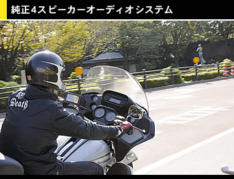 すべてにおいてワンランク上の オートバイのオーディオシステムで、ここまで上質、かつパワフルなサウンドが聞けるとは正直言って驚きました。サウンドクオリティー、操作性などすべてにおいて完璧。とくに重低音の迫力が凄い! ツーリングファミリーのウルトラモデルに標準装備される4スピーカーオーディオシステムは、必要にして十分なサウンドを提供してくれる印象ですね。巨大なフェアリングの効果もあり、風の巻き込みが防止され、聞き応えのあるサウンドをライダー&パッセンジャーに届けてくれます。純正オーディオシステムのミドルクラスと言える出来。 |