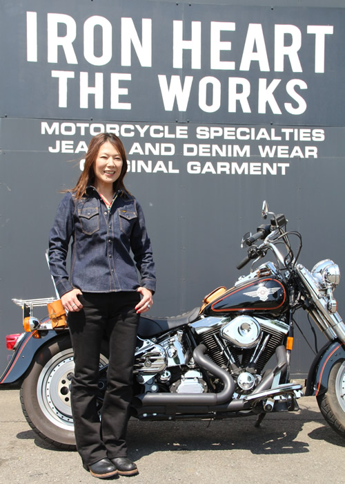 隣にご登場いただいているハーレーに乗る三浦さんの影響でアイアンハートの商品を愛用しているという裕子さん。彼女はバイクを運転せず、タンデムオンリーだが、バイクに乗る時は必ず着用している。愛用している“黒鎧”デニムレディースブーツカット22,000円(税抜き)は裕子さんのもともとのスタイルの良さも手伝って、抜群の曲線美を演出してくれる。もちろんメンズ用と同様の21オンスという厚手の生地だ。