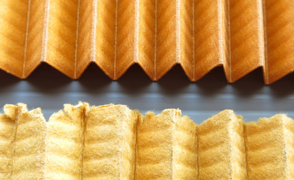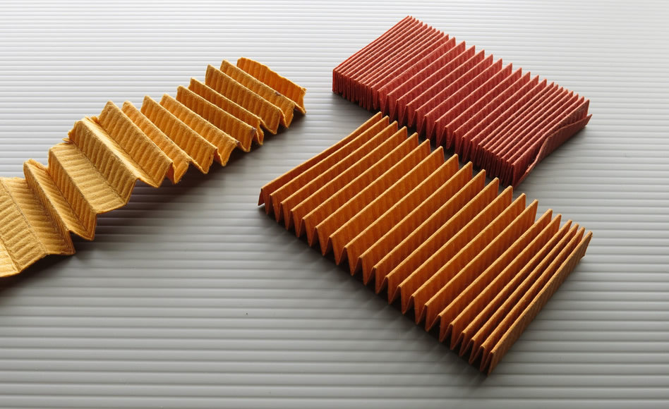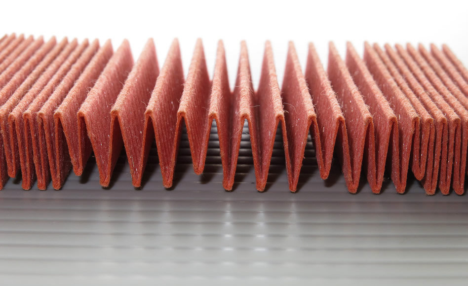 08濾過紙の織り方にも工夫がある。山のピッチを規則的に変更させているMW折りと呼ばれる方法で、オイルの流速アップに貢献する。