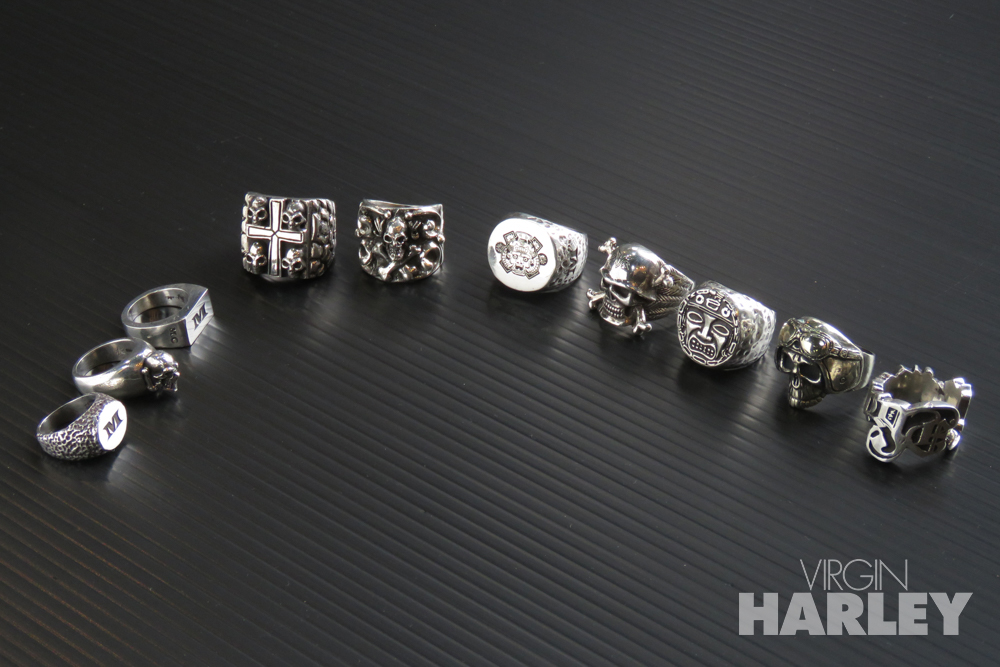各シルバーリング。画面左から、MAY001「3万4,020円(税込)」SOA005「4万8,600円(税込)」MAY002「4万8,600円(税込)」SOA003「13万6,030円(税込)」サンズ・オブ・アナーキー主人公が着用。SOA001「8万482円(税込)」MAY004「6万5,124円(税込)」マヤンズ主人公が着用。SOA002「7万1,928円(税込)」MAY003「12万4,416円(税込)」SOA004「6万1,042円(税込)」ビン・ディーゼル・リベンジリング「9万4,090円(税込)」