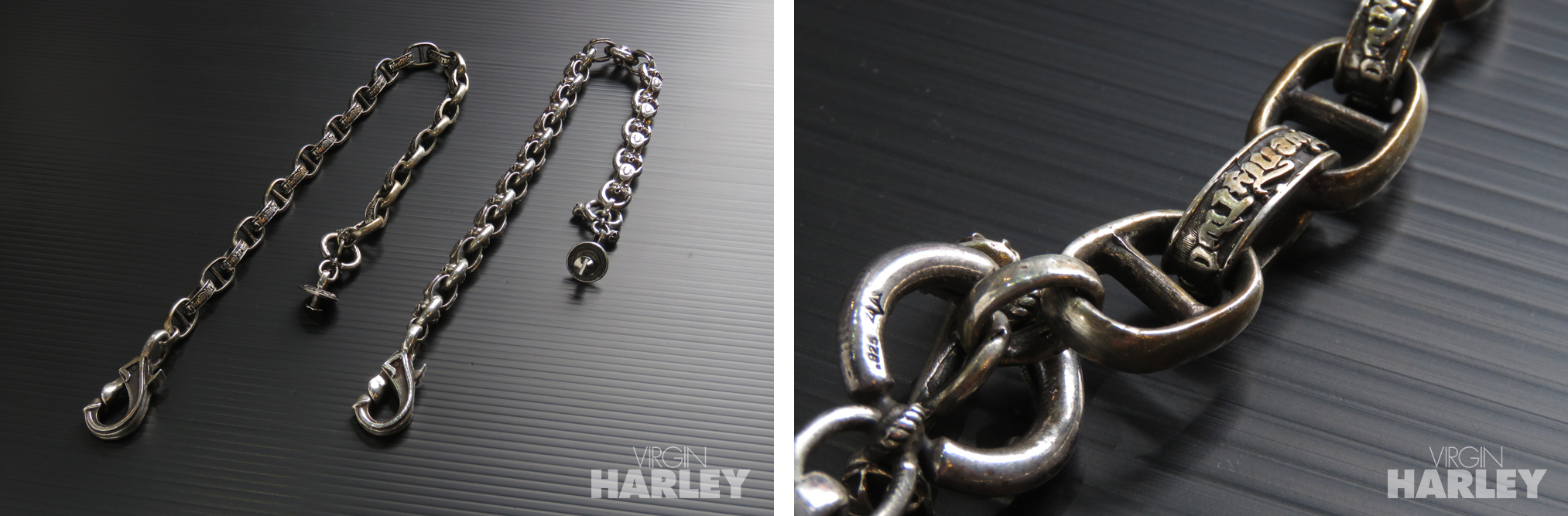 画像左側は、サンズ・オブ・アナーキーモデルのウォレットチェーン。素材はシルバーで、主人公たちが身に付けている。「23万947円(税込)」画面右側は、プリズンアンティークオリジナルカスタムメイドスカル・ウォレットチェーン。「61万4,304円(税込)」