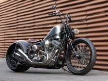 ベースは2002年のソフテイル。前後ホイール交換とスプリンガーフォークの採用で、ベース車が何であるかまったく分からないほどの変貌をとげているが、これもまたフレームはほとんど加工すること無くオールペイントで仕上げられている。全体にブラックアウトされたその外観はクラシカルなムード満点で、ついツインカムモデルがベースであることを忘れてしまいそうだ。