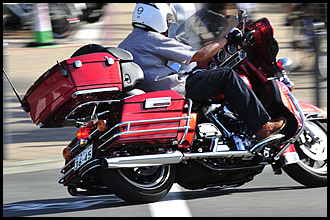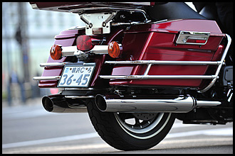 北米マフラーを装着したFLHTCUは瞬時に車体を安定させることが可能。排気音もダイレクトに聞こえてくる。