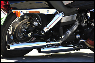 集合部のないオーソドックスな北米マフラーに改装されたFXDFはもはや別物。弾けるような鼓動感とワイルドな音が魅力。