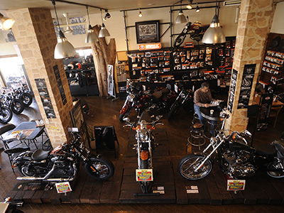 本店から50メートルほどの場所に、H-D正規アパレル専門店がある。こちらも本店同様のウッディな内装で、ハーレーダビッドソンの世界が見事に凝縮されたような空間が魅力だ。