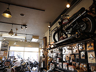 まるでアメリカのルート66にある古いバイク屋をほうふつさせる内装。