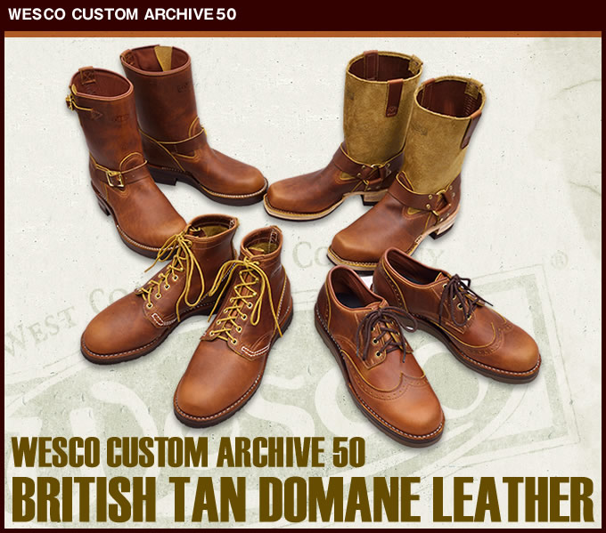 豊富なカスタムメニューをラインナップするウエスコブーツであるが、チョイスするレザーでブーツのイメージは大きく変わる。カラー、質感、仕上げ、そしてその組み合わせの違いで、ブーツの表情は一変するのだ。ウエスコには定番のブラックレザーやブラウンレザーの他に数多くのレザーが用意されているが、今回新たにBRITISH TAN DOMANE(ブリティッシュ・タン・ドマーネ)がラインナップに加わった。