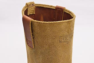 このブリティッシュ・タン・ドマーネは、定番のブラウンレザーよりもやや明るい色味が特徴で、革の銀面(表面)のみに染色する「丘染め」という手法が採用されている。ブーツ制作の際に、つま先やかかとなどの圧が掛かる部位の色が、部分的に明るくなるプルアップレザーの特徴を備え、油分が多く耐久性にも優れている。もちろんその恩恵により、雨などによる防水性も高くバイクライドにも適したレザーとなっている。厚みは5~5.5ozで上品な光沢感も持ち合わせており、非常にジェントルな印象のレザーに仕上げられている。