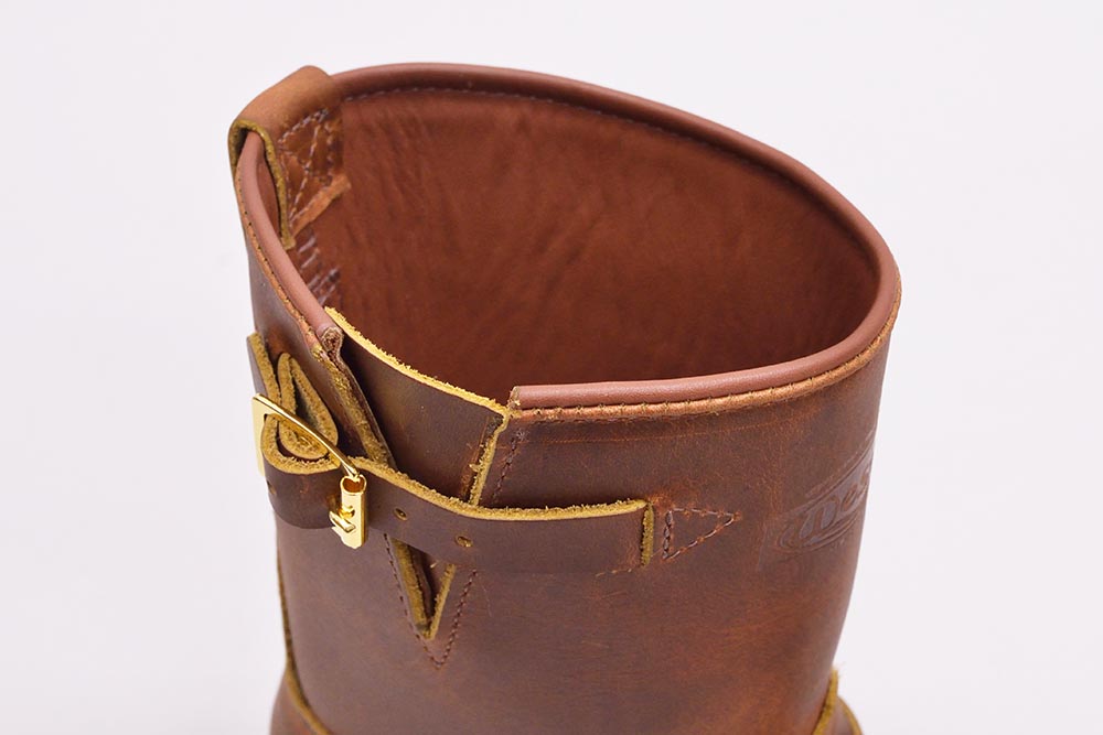 上のメインカットで紹介しているブリティッシュ・タン・ドマーネのカスタムサンプルでイメージを膨らませていただきたい。ボスに代表されるプルオンブーツのバックルはゴールドやブラス、ジョブマスターに代表されるレースアップブーツのアイレット&フックに関してもブラスとの相性が非常にいい。もちろんラフアウトでの使用や他のレザーと組み合わせたりすれば、その可能性は無限大。愛機のカラーとのコーディネイトなども洒落ている。ぜひレザーの新たな選択肢としてこのブリティッシュ・タン・ドマーネを加えてみてはどうだろうか。