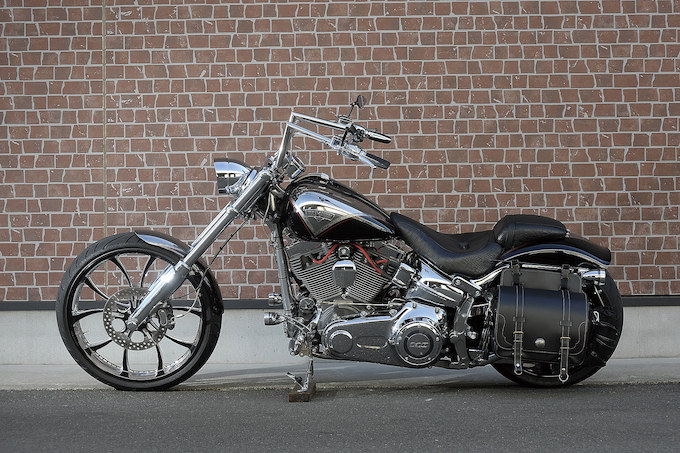 レオチンさんの乗るブレイクアウトは2013年モデル。メーカー純正カスタムの中でも飛びきり派手なブレイクアウトCVOをベースに、ロングフォークを装着。さらにゴージャスな現代版のチョッパーを製作してしまった。